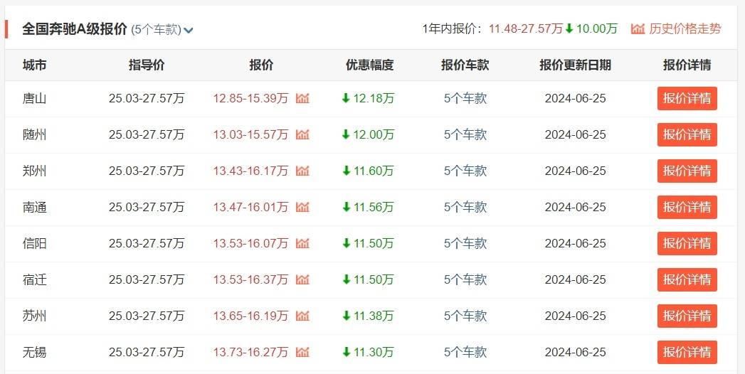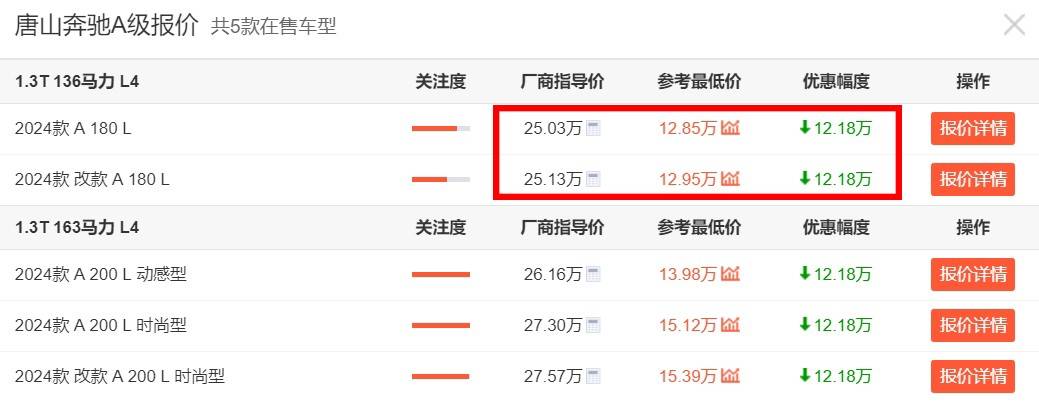 而在終端價格方面,由于受到了國產新能源車崛起所導致的市場空間被不斷擠壓,目前奔馳A級最低也已經是跌入至了12.85萬的價格區間。而優惠幅度則是能達到12.18萬元之多,相當于在原先指導價的基礎上給打了個五折,這你敢相信嗎?